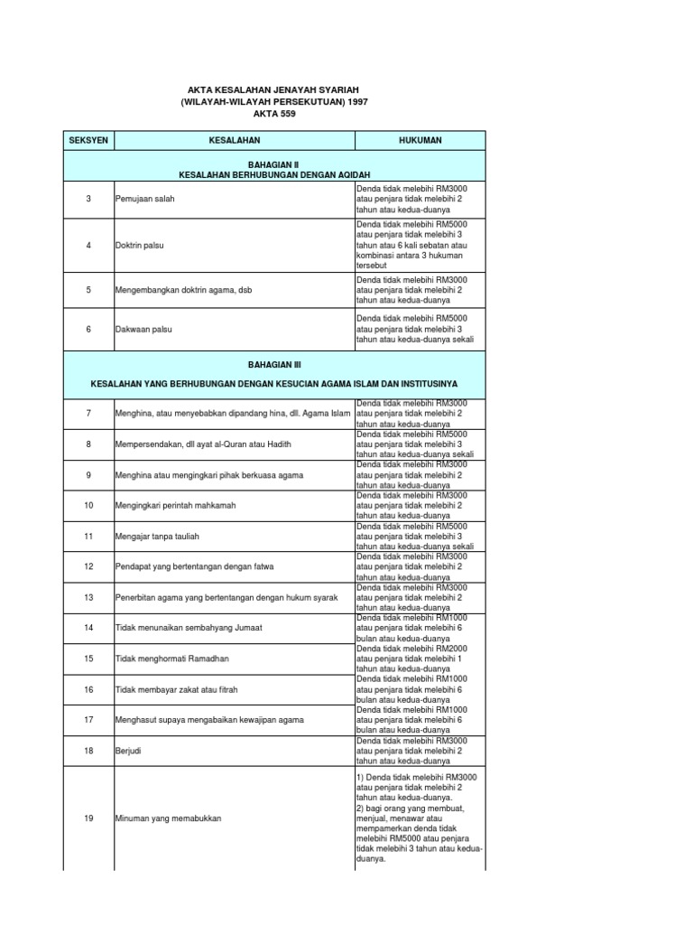 Bidangkuasa kuasa hukuman takat hukuman berdasaran seksyen 2 akta mahkamah syariah(bidang kuasa jenayah)1965 (pindaan). Kesalahan yang berhubungan dengan akad kota kinabalu: Kesahan kesalahan jenayah syariah juga pernah dicabar di mahkamah persekutuan, namun semuanya lulus ujian kesahan itu. Di malaysia, apabila sesuatu kesalahan jenayah syariah dilaporkan, pegawai penguatkuasa agama di bawah bahagian siasatan jabatan agama islam negeri akan memulakan siasatan untuk mengumpul bukti dan keterangan. Ia membabitkan kategori kesalahan terhadap akidah.