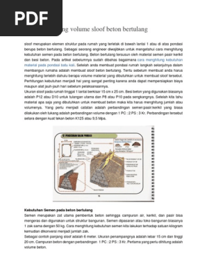 Berikut ini paparan tentang cara menghitung kubikasi beton. Pada suatu bangunan atau rumah, sloof dipasang secara memanjang diantaraselengkapnyamenghitung volume beton, bekisting, serta besi tulangan untuk sloof Hitung volume sloof, pada hitungan ini volume sloof adalah : Jadi kebutuhan beton yang diperlukan adalah 1m3. Jadi rekapitulasi kebutuhan besi sloof adalah diameter kilo gram batang meter 8p 40,08 10 100,2 10p 82,6584 13 133,32 kebutuhan beton pada balok sloof v=lxtxp volume beton sloof = lebar x tinggi x panjang v = 0,15 m x 0,20 m x 33,33 m = 0,99 m3 dibulatkan 1 m3. Jadi p x l x t = 6 x 0,15 x 0,2 = 0,18 m 3. Jadi volume pasangan beton kolom = 105 x 0.024 = 2.52 m3. Gambar detail pondasi,sloof dan kolom. Va = b x h x p. Mengenai cara menghitung volume besi beton bertulang akan kita jelaskan sebagai berikut: Tips untuk menghitung volume sloof rumah, silahkan ikuti tahapan dibawah : Sloof mendapatkan beban tarik dan tekan dan menjaga agar pondasi dan tembok tetap pada posisinya. Volume beton sloof = lebar x tinggi x panjang;